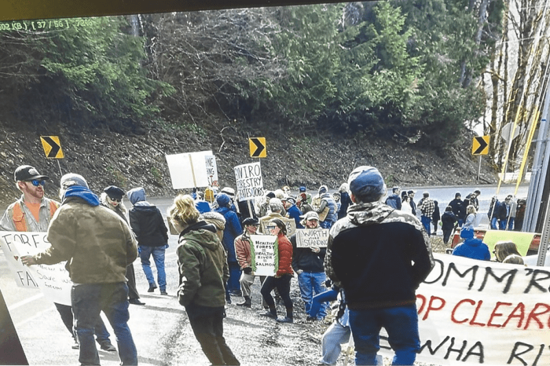 The photo below shows demonstrators protesting clear-cutting in the Elwha river watershed.